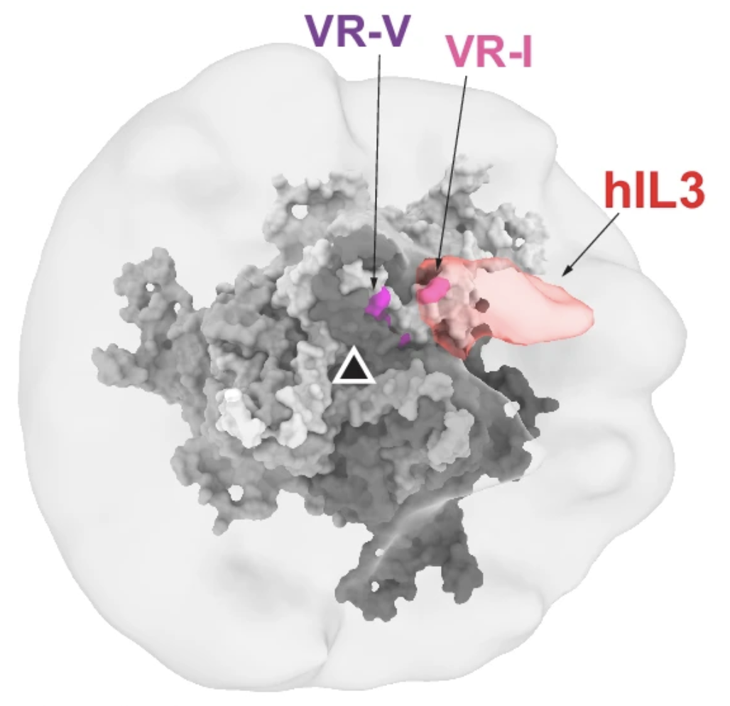 Cryo-Electron Tomography map of IL3 interaction with AAV9, with interacting capsid variable regions identified via SPR noted.