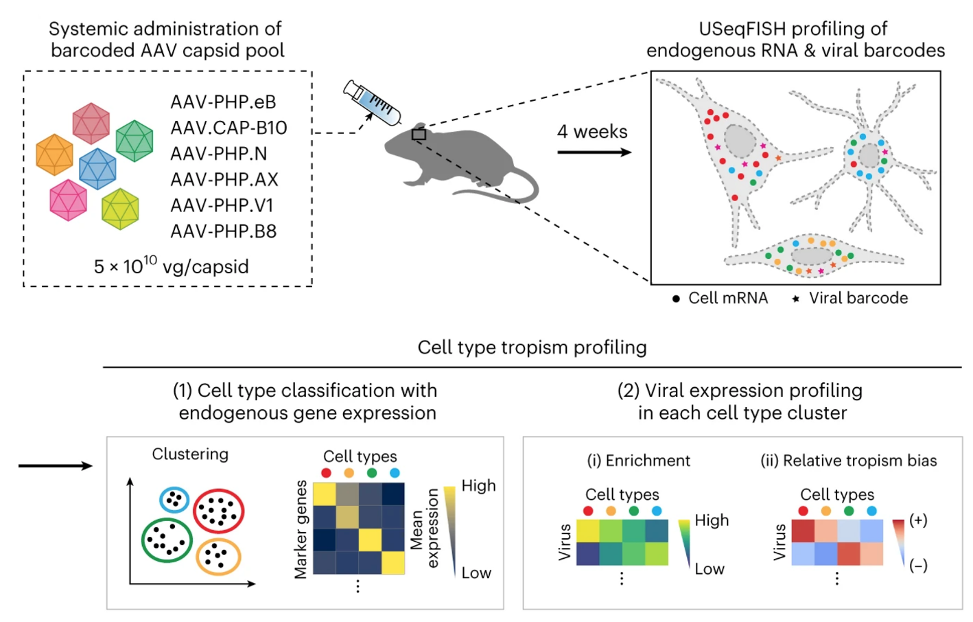 CLOVER-affiliated Postdoctoral Fellow Min Jee Jang and collaborators have developed a new spatial transcriptomics method for high-throughput, in situ characterization of AAV tropism, called USeqFISH. Using this method they profile pooled engineered AAV capsids and cargoes, finding preferences among molecularly-defined neuronal cell types. They also introduce a new capsid AAV-PHP.Across (PHP.AX) that has relatively unbiased and broad coverage across cell types. See the research briefing and the full story in Nature Biotechnology. Congratulations!